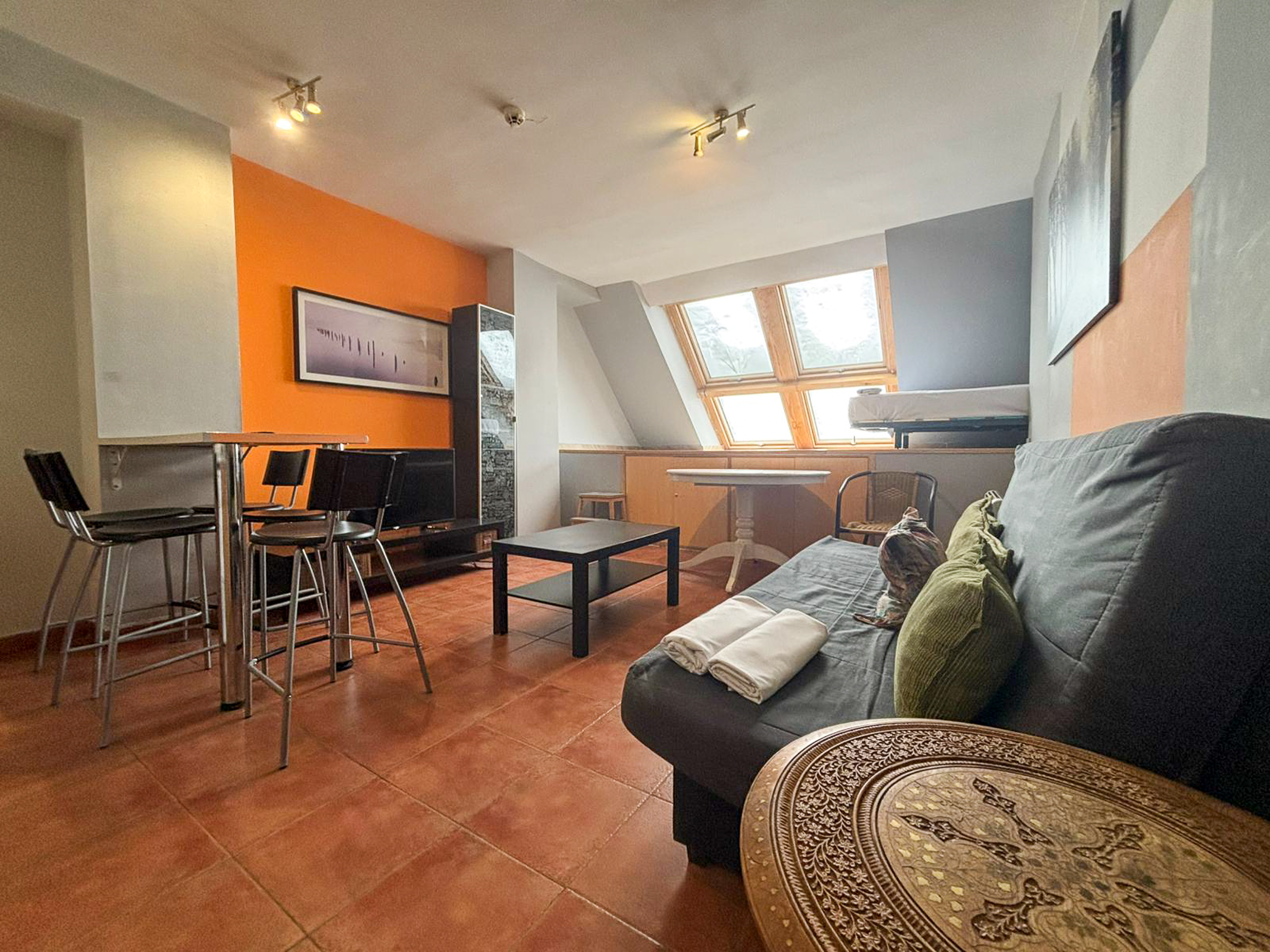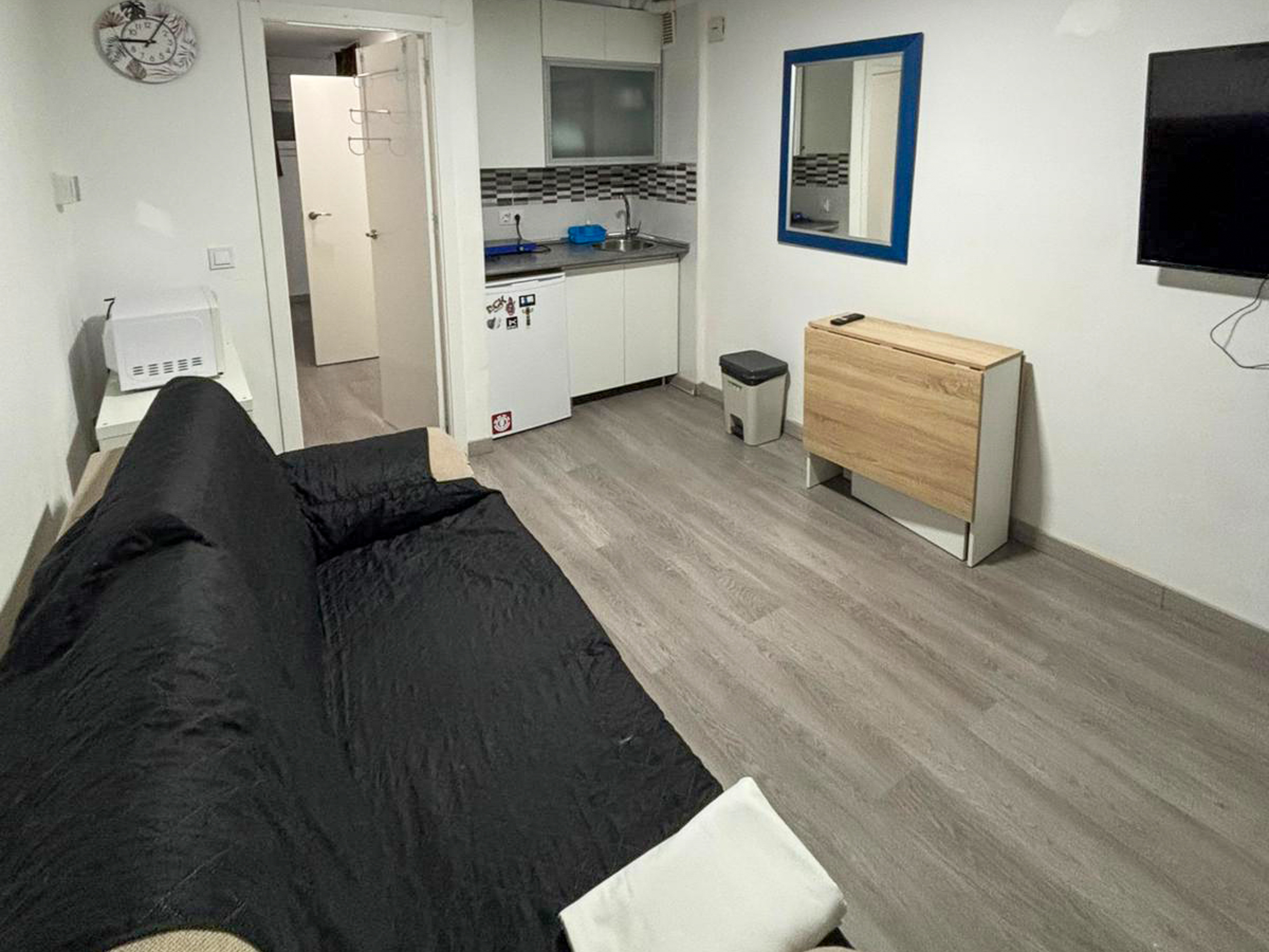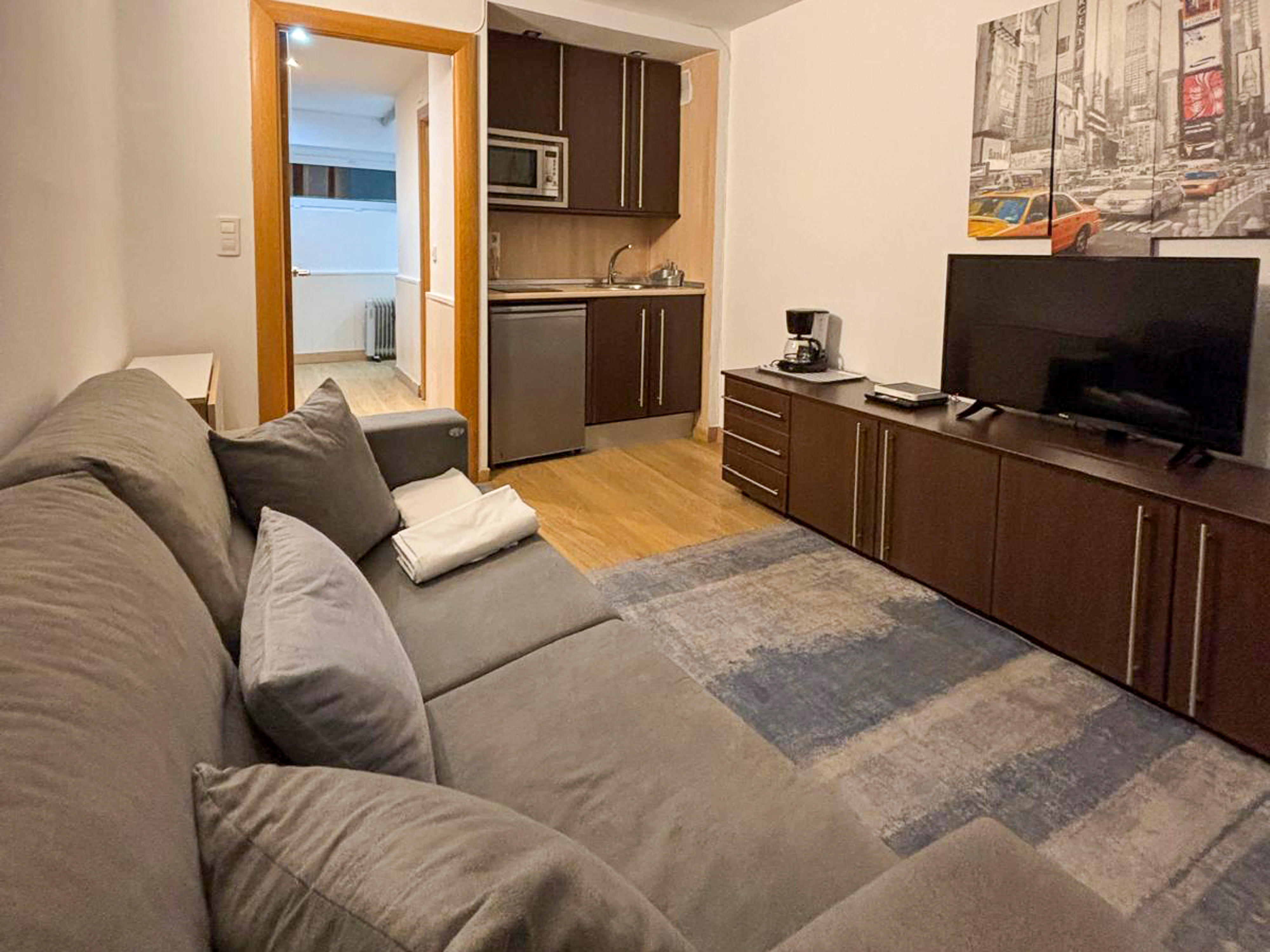 Estudio para 2 personas: Salón con sofá cama doble, cocina americana y baño.