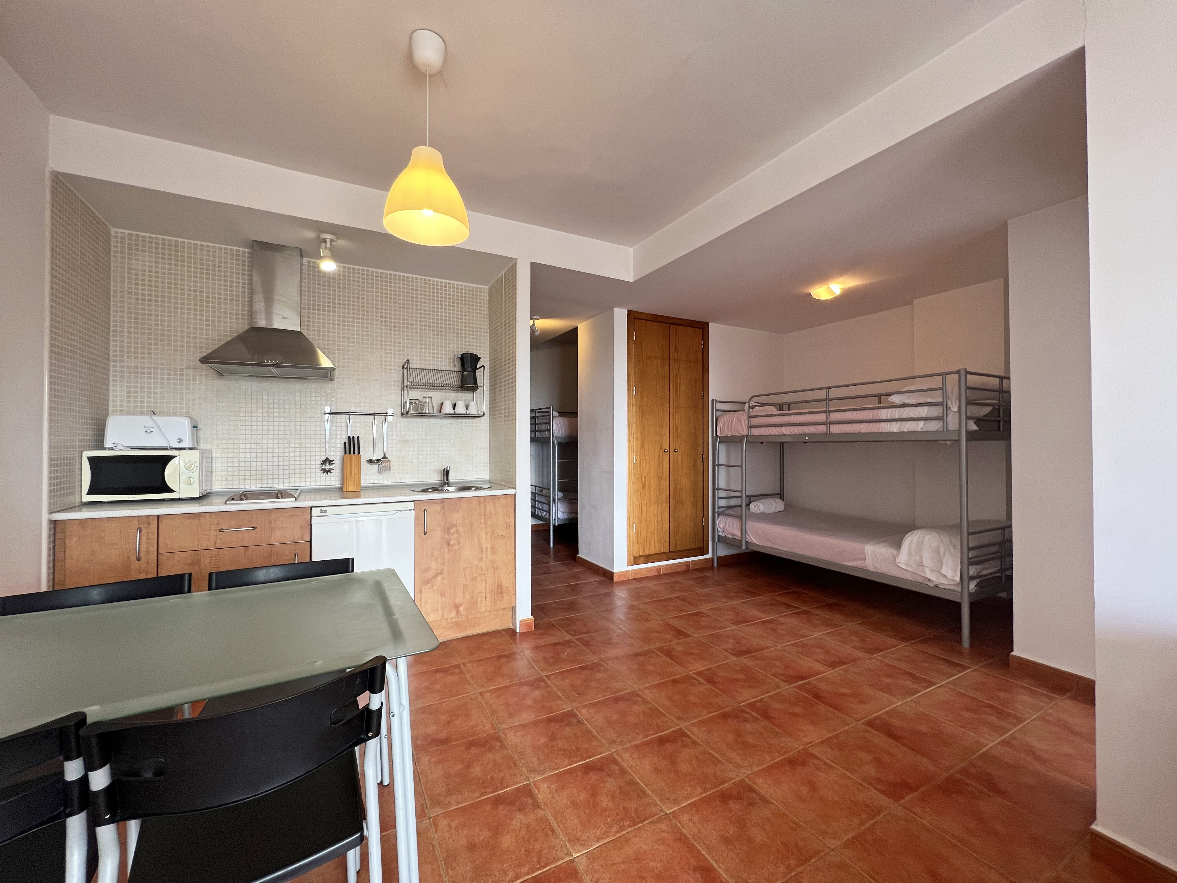 Apartamentos para 3/5 personas: un dormitorio con tres camas indivuduales o una doble y otra individual, más un sofá cama de dos plazas en el salón-comedor, cocina y baño.
