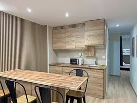 Le séjour, avec sa cuisine ouverte sur la salle à manger, offre un espace lumineux et aéré idéal pour se détendre, partager des repas ou se relaxer après une journée de ski. Il comprend également un canapé-lit deux places, permettant d'accueillir un plus grand nombre de personnes.